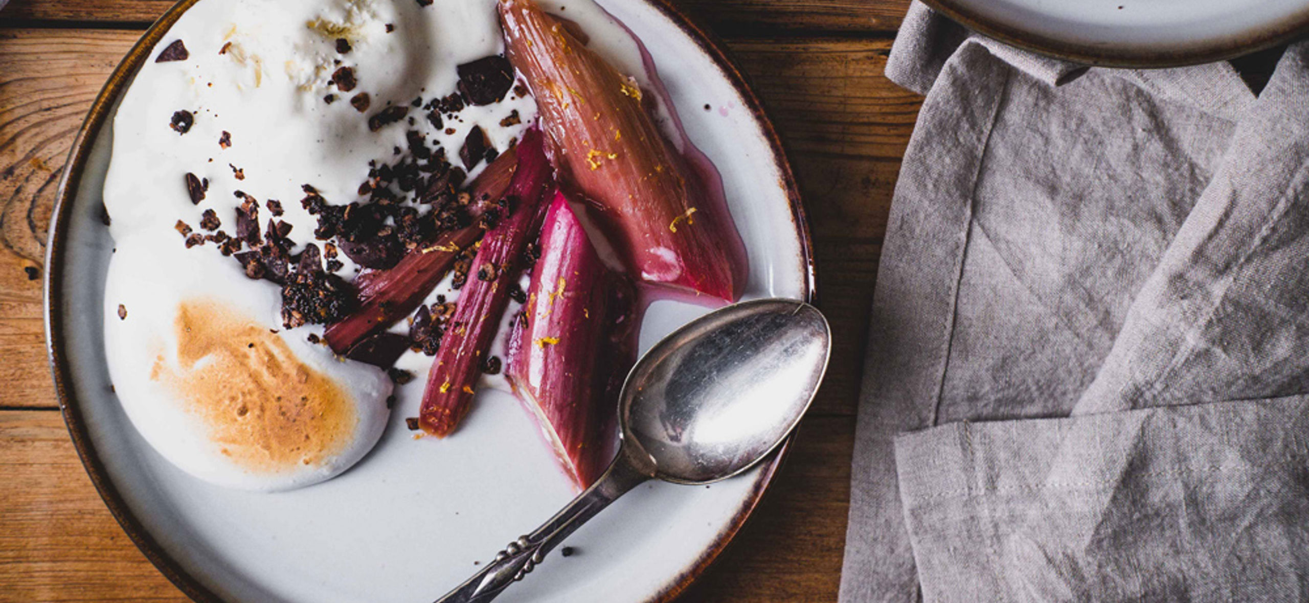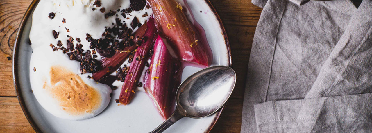 Pocheret rabarber med softice, marengs og crumble
