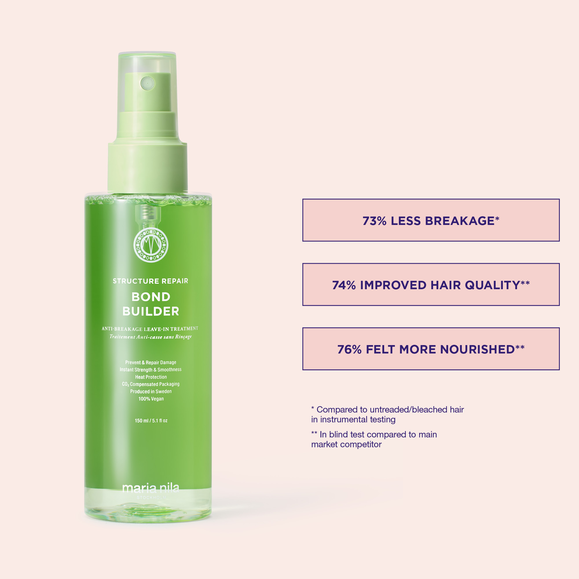 Bond Builder fra Maria Nila er en innovativ leave-in treatment, der er designet til at beskytte og reparere dit hår. Denne behandling er ideel for dem, der ønsker at styrke og blødgøre deres hår, samtidig med at det beskyttes mod skadelige miljøpåvirkninger. En af de største fordele ved Bond Builder er dens evne til at fungere som en varmbeskyttende behandling, der kan modstå op til 230 grader, hvilket gør den perfekt til brug før styling med varmeværktøjer.